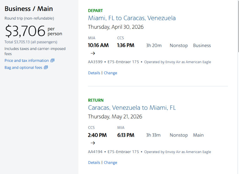 El costo del boleto para esta fecha inaugural con una ruta que va desde Miami a Caracas y a Miami de vuelta es de 3.706 dólares por persona.